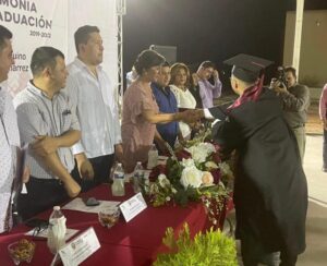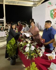 En una emotiva ceremonia de graduación realizada en la cancha del plantel de CECyTE, la alcaldesa atestiguó la culminación de los estudiantes de nivel medio superior mediante la entrega de certificado.