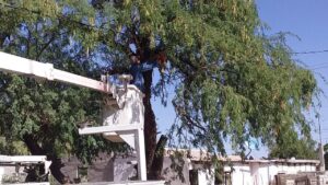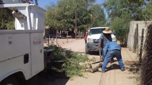 Debido a una problemática que se presentaba en el tendido eléctrico, se llevó a cabo la poda de varias ramificaciones de mezquite que rodeaban y rozaban los cables de conducción eléctrica, así mismo para evitar algún inconveniente futuro, se llevó a cabo el trabajo del reporte de la ciudadanía a Servicios Públicos Municipales a cargo de Jesús Vingochea H. y su equipo asistente de podar los tallos y brotes de mezquite.